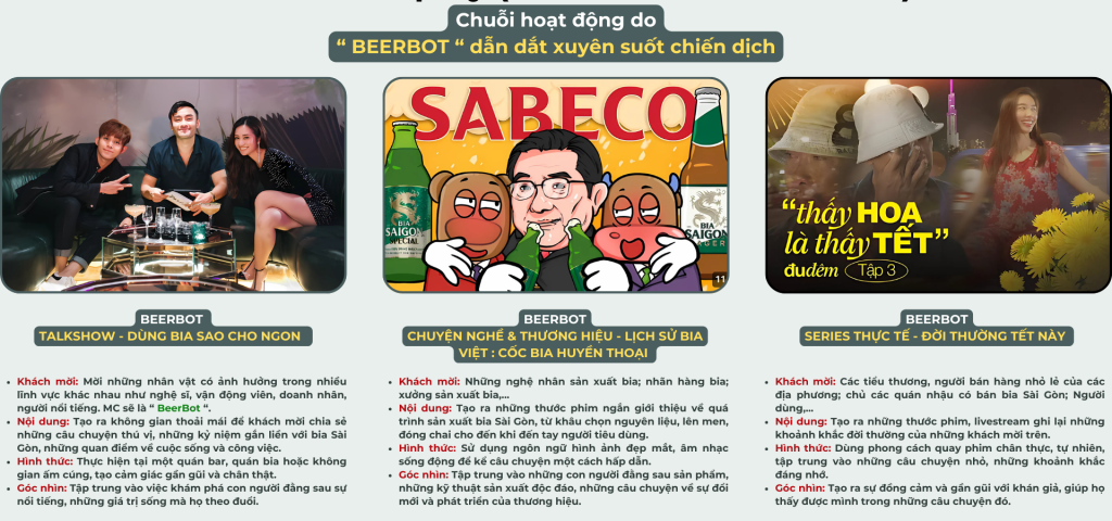 Beerbot là nhân vật ảo đầu tiên của Sabeco x SVA, ra mắt như một phần của chiến dịch Tết 2025, kết hợp giữa công nghệ hiện đại ( AI, AR/VR, Machine ) và văn hóa truyền thống Việt Nam. Beerbot không chỉ là biểu tượng sáng tạo mà còn là một công cụ kết nối khách hàng với thương hiệu thông qua các trải nghiệm cá nhân hóa, tương tác thời gian thực và nội dung độc đáo.