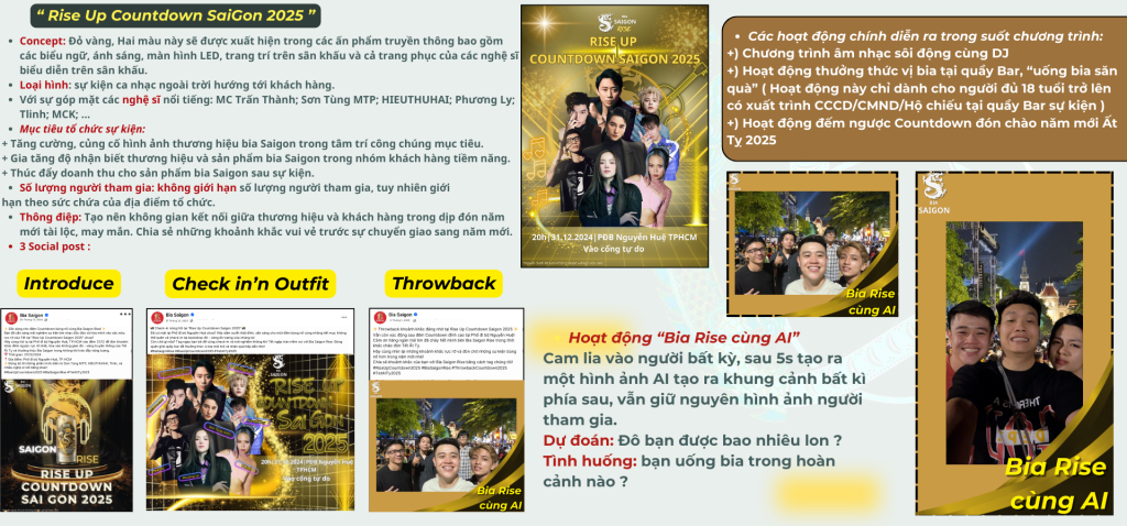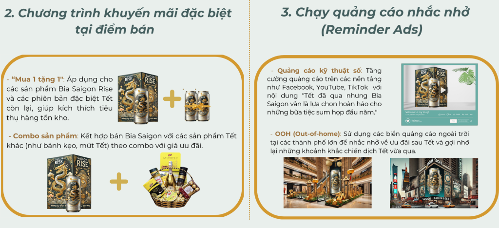 Về mặt promotion, Sabeco triển khai các chương trình khuyến mãi hấp dẫn như “Mua Bia Săn Quà” và “Nâng Ly Trúng Thưởng,” mang đến những phần quà lì xì Tết, voucher mua sắm, và thậm chí là cơ hội nhận thùng bia miễn phí. Không chỉ dừng lại ở đó, sự kiện Countdown 2025 tại phố đi bộ Nguyễn Huệ còn tạo cơ hội cho khách hàng trải nghiệm các trò chơi tương tác độc đáo và tham gia các thử thách vui nhộn, gắn kết mọi người qua ly bia Saigon Rise.