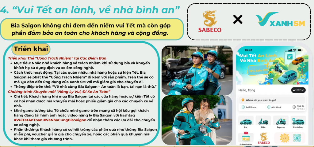 Đặc biệt, Sabeco và XanhSM đã tạo nên sự kết hợp độc đáo giữa hai thương hiệu Việt mang tầm nhìn hiện đại. Hợp tác này không chỉ phản ánh tinh thần sáng tạo và đổi mới, mà còn là lời khẳng định vị thế của các thương hiệu Việt trên thị trường. Dịch vụ “Giao Hàng Xanh” sử dụng phương tiện vận tải điện của XanhSM cho việc giao bia Tết không chỉ đảm bảo sự tiện lợi, nhanh chóng mà còn giảm thiểu tác động đến môi trường. Đây là một bước tiến quan trọng, vừa hiện đại hóa quy trình kinh doanh, vừa nhấn mạnh giá trị bền vững, phù hợp với xu hướng tiêu dùng của thế hệ trẻ.