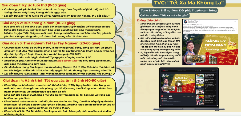 TVC “Tết Xa Mà Không Lạ” là câu chuyện giàu cảm xúc, kể về hành trình xuyên Việt của một nhân vật chính – Khoai Lang Thang, đại diện cho người trẻ hiện đại, khám phá ý nghĩa Tết qua các vùng miền. Thông điệp chính là dù đi xa, Bia Saigon vẫn luôn là sợi dây kết nối truyền thống, gia đình, và những giá trị Việt trong mùa lễ hội.